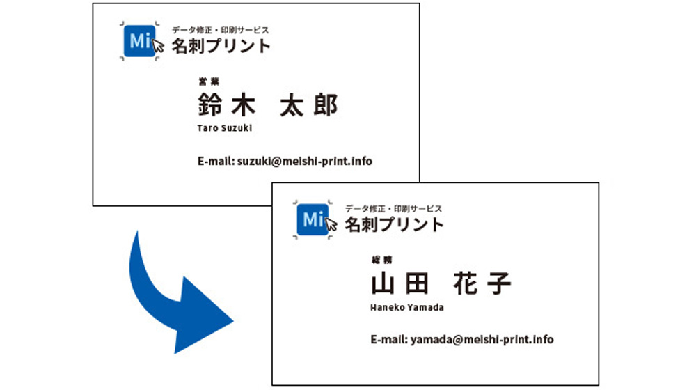 レイアウトやデザインに変更がない範囲であれば、氏名・役職・電話番号・メールアドレスなど、文字情報の変更を追加料金なしで対応します。