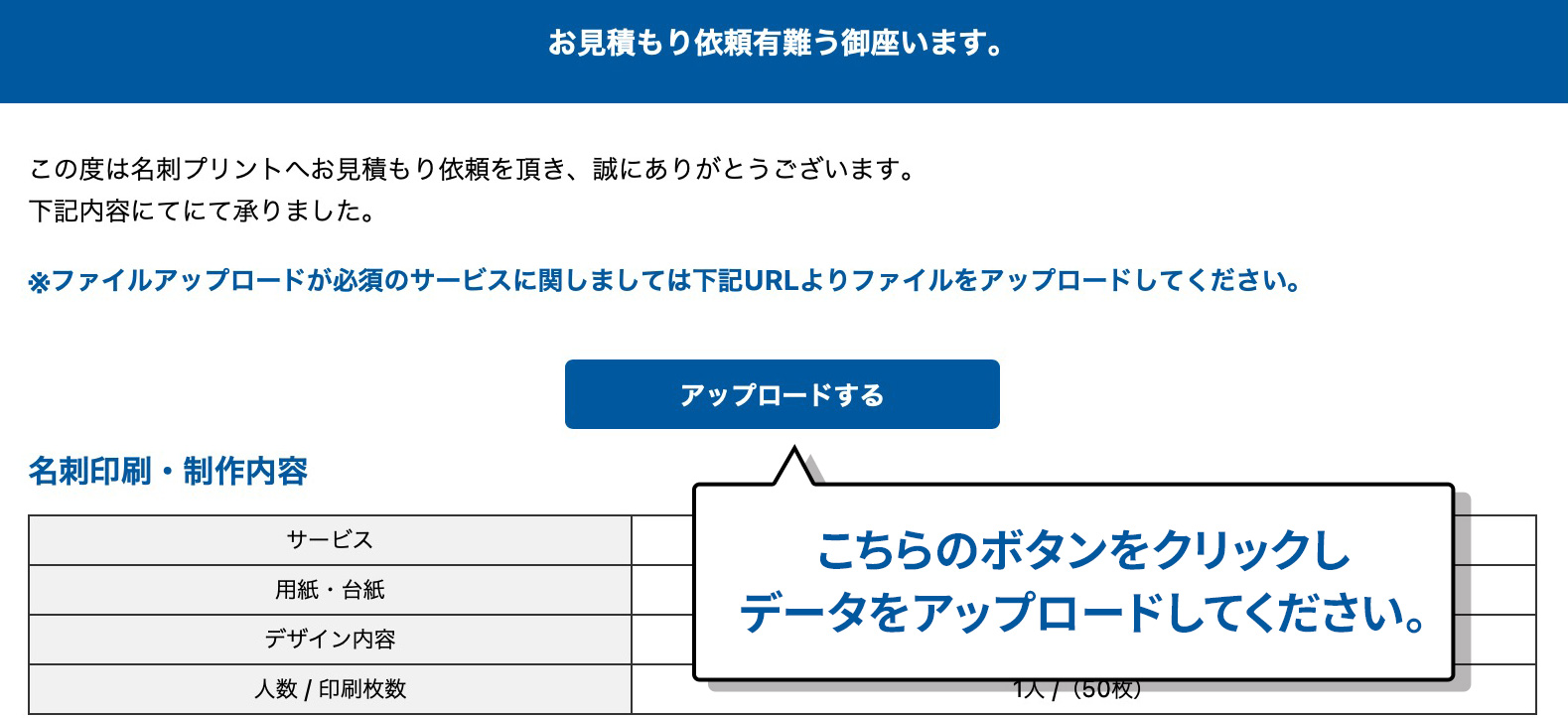 お見積もりフォームにて必要事項を入力後、アップロードページへ遷移します。そちらにでデータをアップロードください。( ※入力頂いたメールにも、同様にアップロードのご案内のリンクをご連絡致します。)